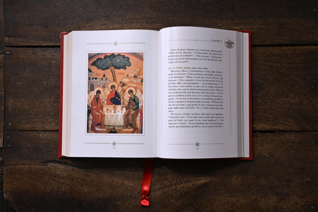 Il volume di grande formato, che raccoglie i testi dei quattro evangelisti nella traduzione curata dalla CEI, è introdotto dalla presentazione di mons. Matteo Crimella, membro del Collegio dei Dottori della Biblioteca Ambrosiana. A lui, in quanto rappresentante della Biblioteca, è stata formalmente donata la copia n.005 dell’opera, che sarà custodita presso la prestigiosa sede culturale milanese.